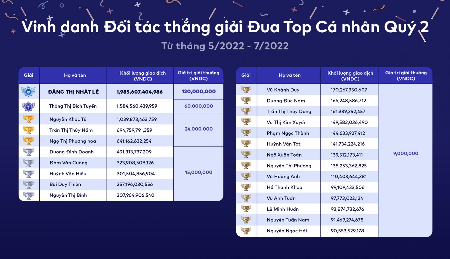 Chúc mừng Đối tác Đặng Thị Nhật Lệ và Thông Thị Bích Tuyền với khối lượng giao dịch lần lượt là 656 tỷ VNDC và 605 tỷ VNDC đã xuất sắc cán mốc thưởng 10%, nhận thưởng trị giá mỗi người hơn 30 triệu VNDC