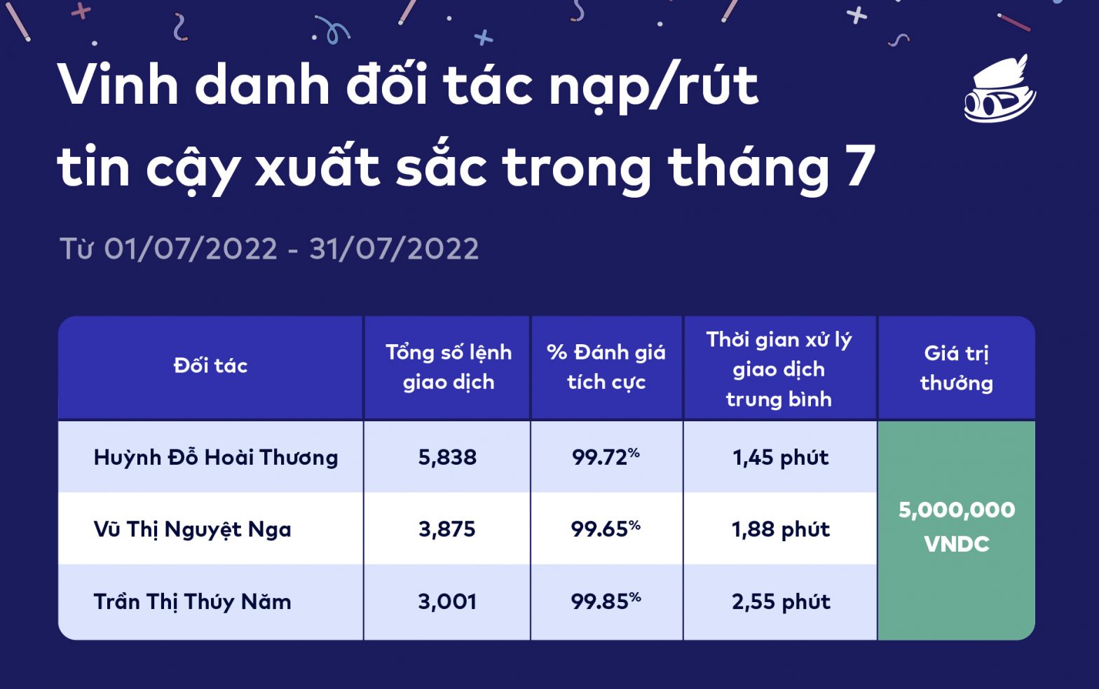 Vinh danh đối tác nạp/rút tin cậy xuất sắc tháng 7