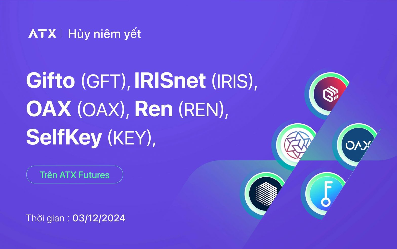 Hủy niêm yết GFT, IRIS, KEY, OAX, REN Token trên ATX Spot và Futures từ ngày 03/12/2024.