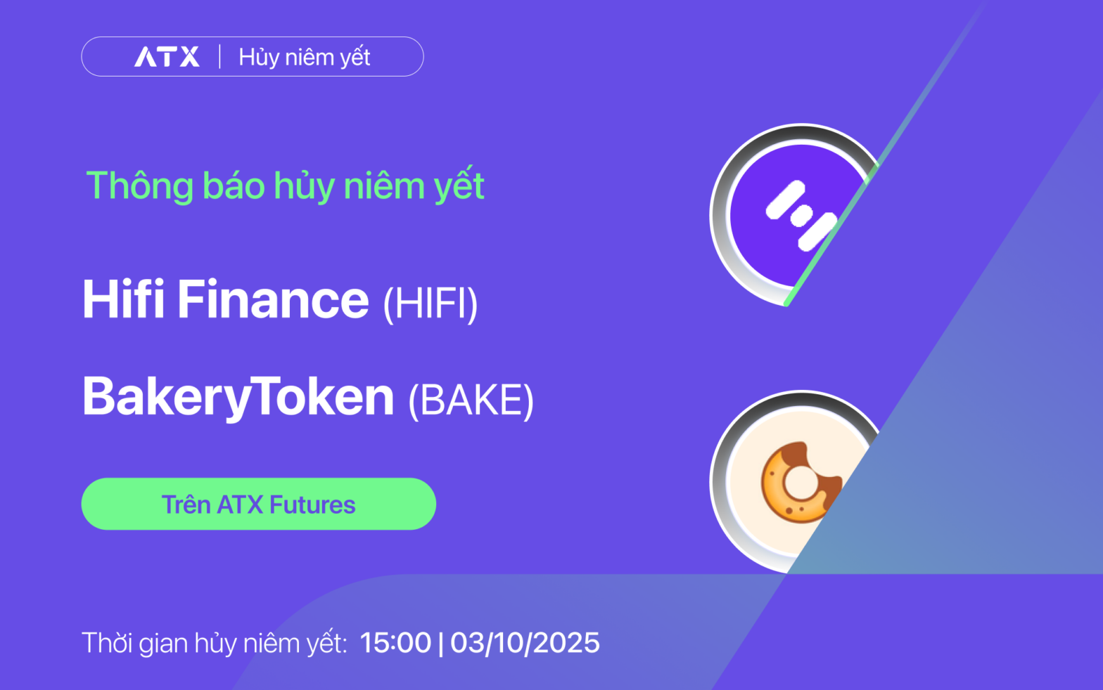 Hiện nay, các sàn giao dịch quốc tế đã có kế hoạch gỡ bỏ giao dịch với HIFI & BAKE token. Theo đó, ATX xin thông báo: Huỷ niêm yết các cặp giao dịch HIFI/USDT, HIFI/VNDC; BAKE/VNDC, BAKE/USDT trên ATX Futures.