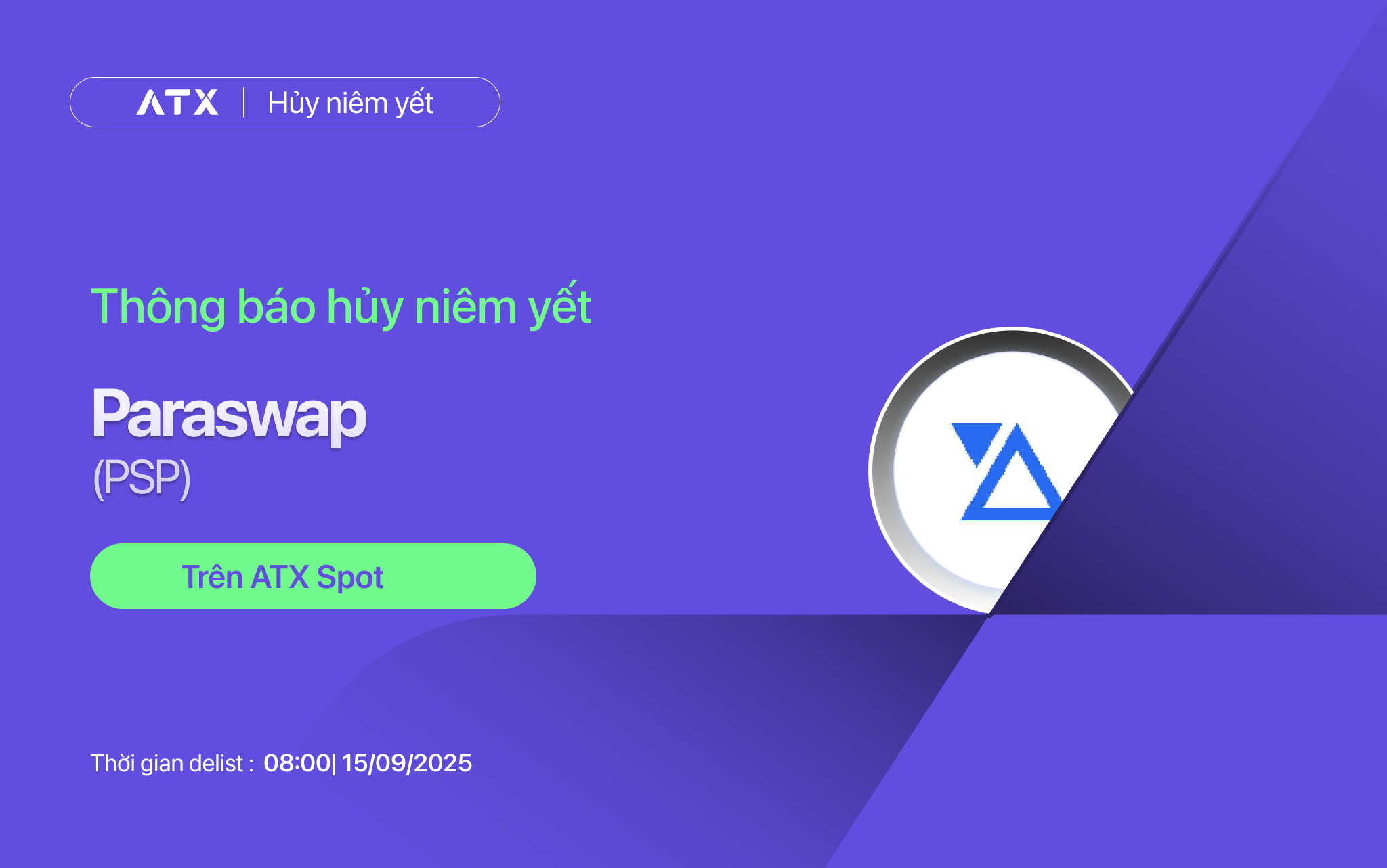 - Các cặp giao dịch: PSP/USDT, PSP/VNDC sẽ bị ngừng giao dịch và huỷ niêm yết trên ATX Spot kể từ thời điểm trên. Các lệnh được đặt sẽ tự động huỷ sau khi các cặp giao dịch bị huỷ niêm yết.