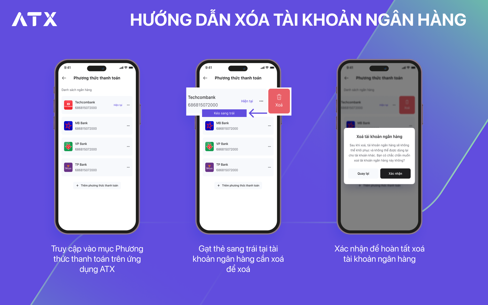 Lưu ý: Tài khoản ngân hàng đã xoá khỏi ATX sẽ không thể thêm vào lại trong tương lai.